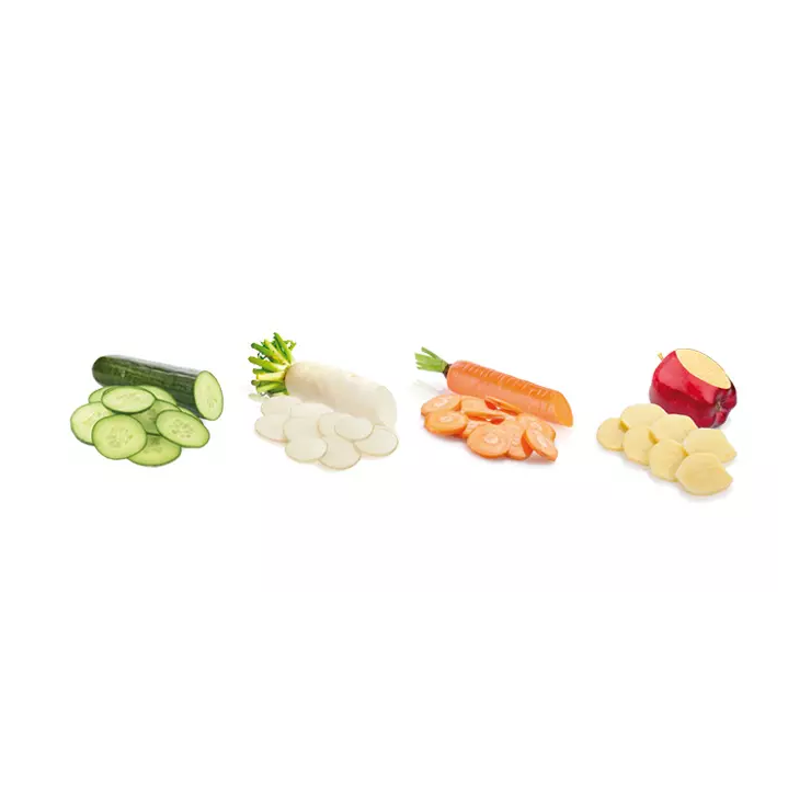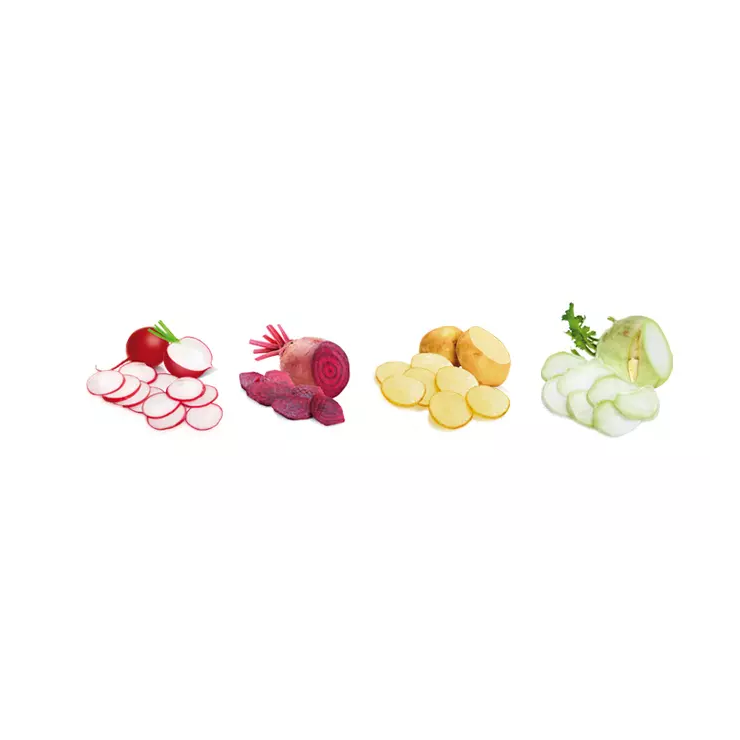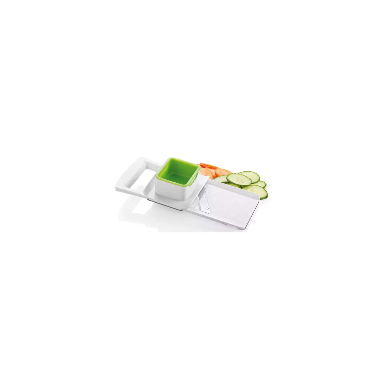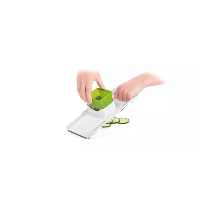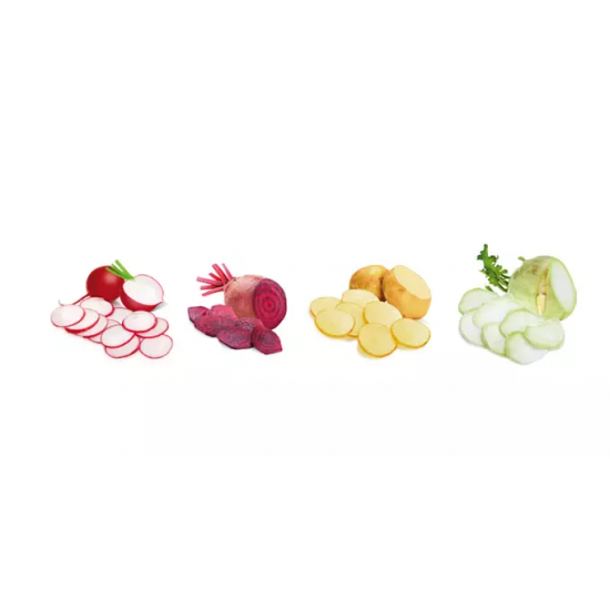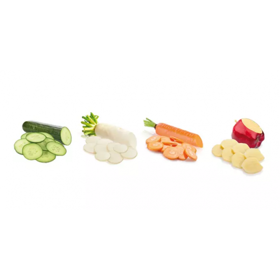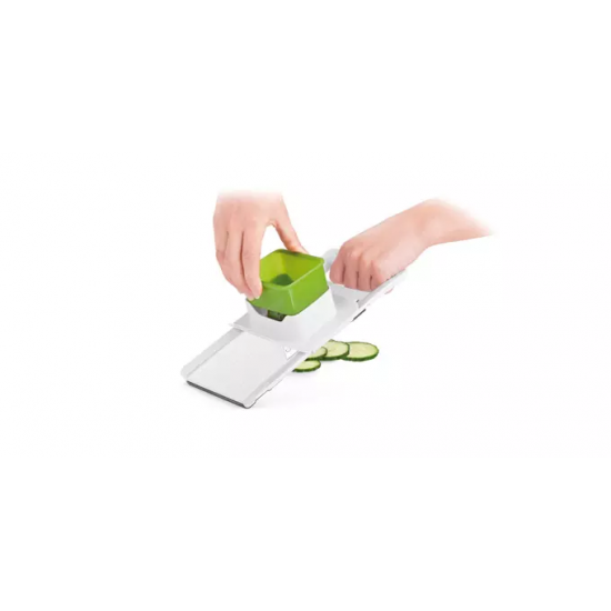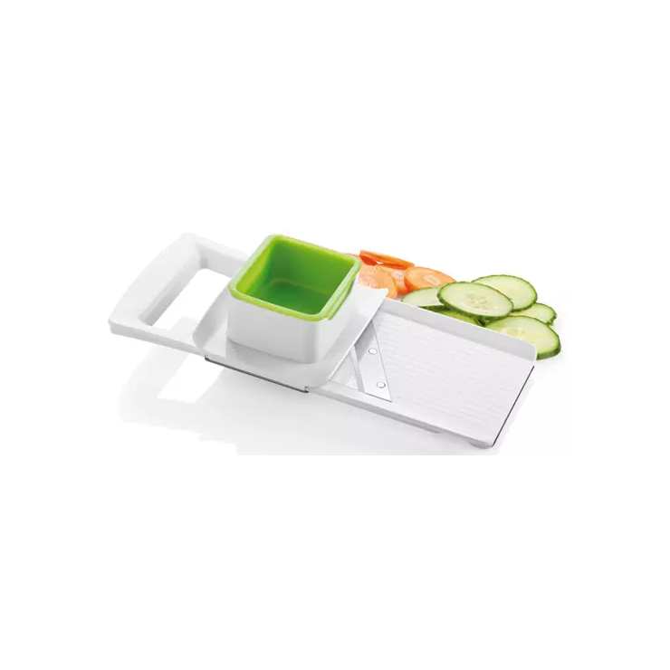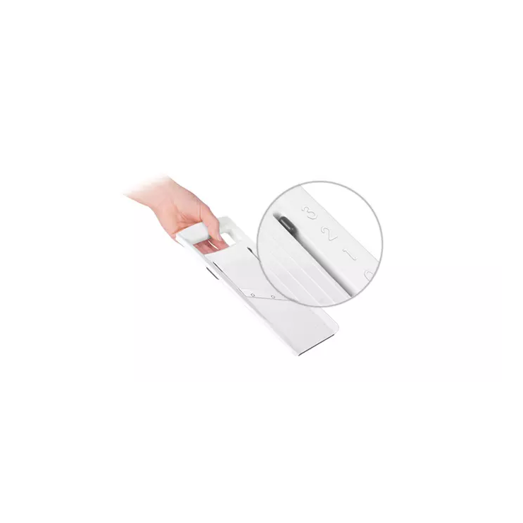 Rallador con cuchillas ajustables con grosor de corte de 1, 2 y 3 mm, afilada hoja de acero inoxidable y tratamiento antideslizante. Garantía de 3 años.