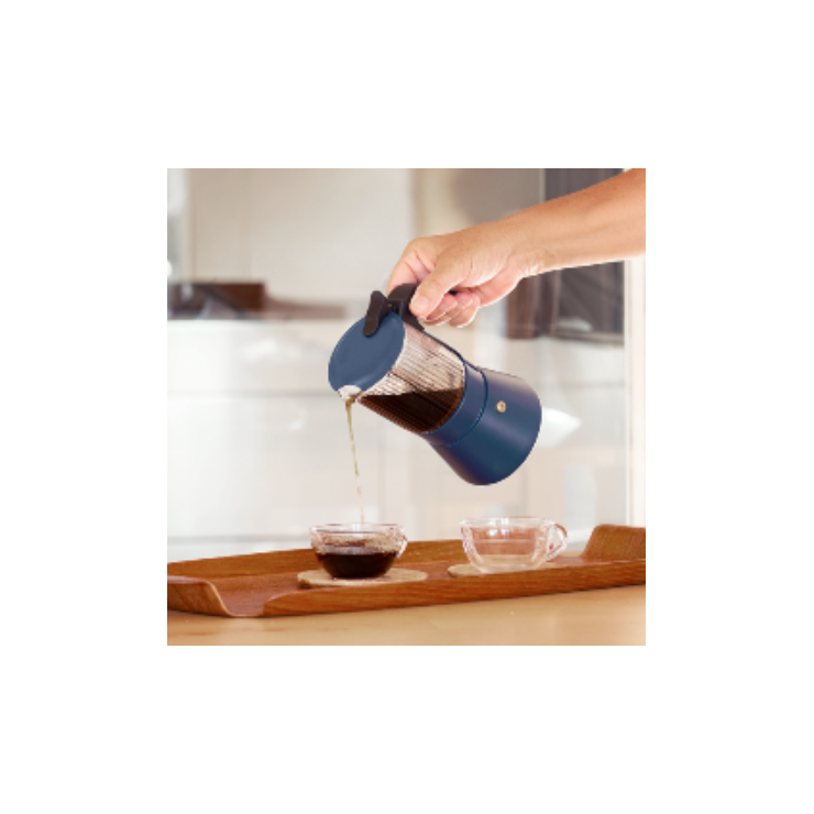 - El cuerpo superior está fabricado en vidrio borosilicato de alta resistencia, lo que te permite ver el proceso de preparación y disfrutar del aroma desde el primer momento. Además, incorpora una válvula de seguridad para un uso confiable y un asa de baquelita termoaislante que garantiza una sujeción cómoda y robusta.