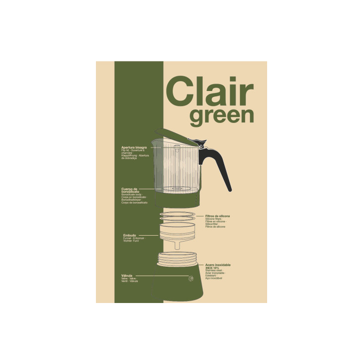 El cuerpo superior está fabricado en vidrio borosilicato de alta resistencia, lo que te permite ver el proceso de preparación y disfrutar del aroma desde el primer momento. Además, incorpora una válvula de seguridad para un uso confiable y un asa de baquelita termoaislante que garantiza una sujeción cómoda y robusta.
