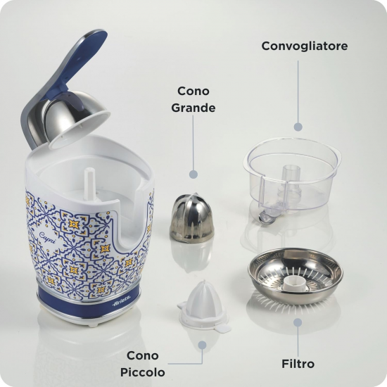 Este exprimidor de elegante forma retro, con acabado en metal y detalles cromados, es ideal para todos los amantes de zumos de frutas saludables. Dispone de 2 conos de diferentes tamaños. Muy fácil de usar gracias a su mango a presión. Podrás disfrutar de un jugo concentrado, sin oxidación, saludable y suave sin residuos. Más que un tostador; un complemento para decorar la cocina. Más que un exprimidor; un complemento para decorar la cocina.
