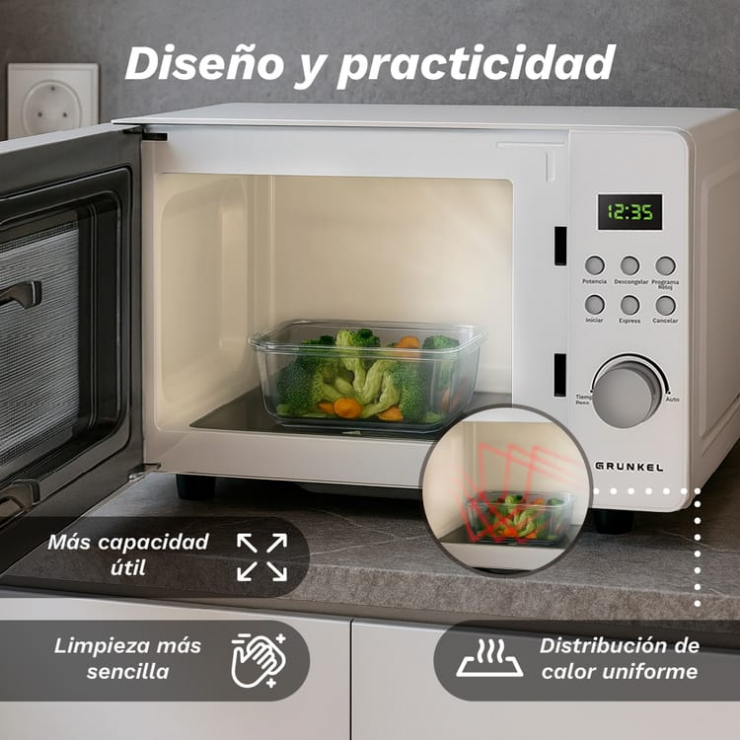 - Su diseño sin plato giratorio, con base de vidrio plana, maximiza el espacio interior y mejora la estabilidad al calentar recipientes grandes o rectangulares.
