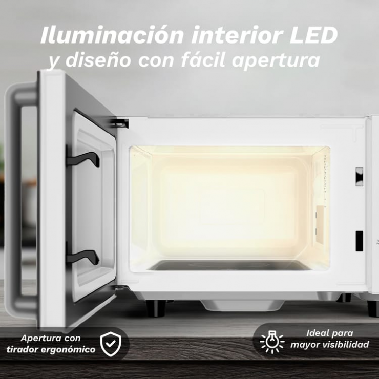 - El microondas de 20 litros con 700 W ofrece una experiencia de cocinado moderna, sencilla y funcional.