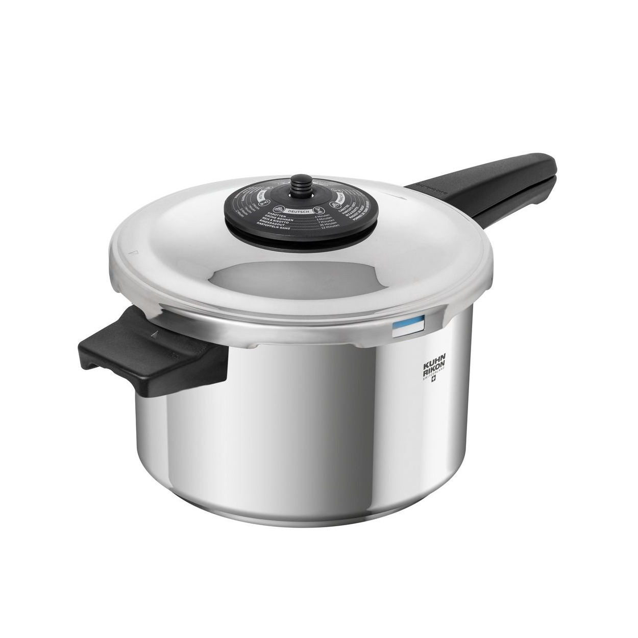 Olla a presión con los tiempos de cocción de un vistazo: Para aquellos que prefieren tener en su mente las deliciosas recetas creadas por ellos mismos en lugar de los tiempos de cocción, podrás encontrar los más importantes sobre el disco de protección de la DUROMATIC® CLASSIC NEO. Los tiempos de cocción para todas las demás comidas y platos que puede preparar con la olla a presión se encuentran en la tabla de tiempos de cocción adjunta, en las instrucciones de uso o en la app. La DUROMATIC® se fabrica en Suiza desde 1949. Gracias a su alta calidad, es muy duradera.