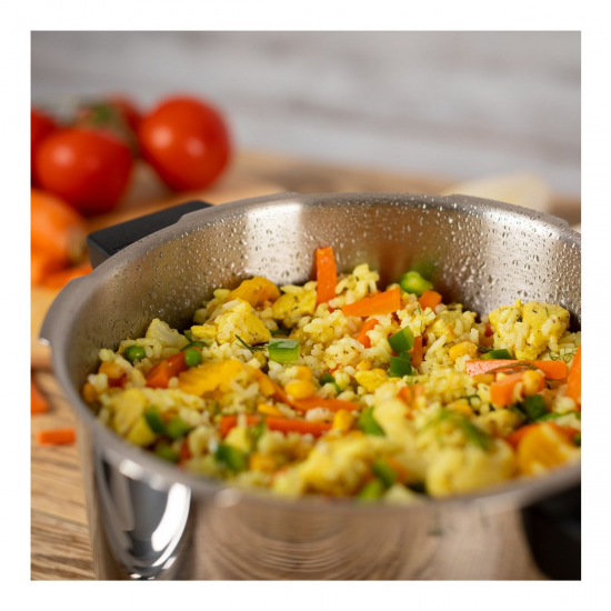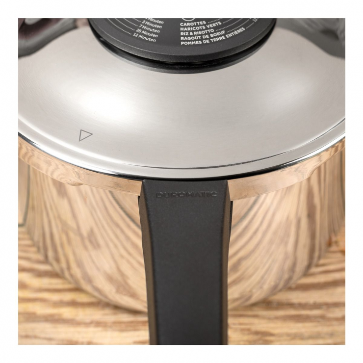 Cocinar en la DUROMATIC® es hasta un 70% más rápido y saludable ya que las vitaminas y nutrientes se conservan mucho mejor. Por ejemplo, cocinando en una olla a presión se conserva el doble de vitamina C* que cocinando en una olla normal. Además, se ahorra hasta un 70% de energía. El triple mecanismo de descompresión garantiza la seguridad en todo momento. Las asas laterales ergonómicas se adaptan cómodamente a tus manos, tanto si la DUROMATIC® está abierta como cerrada, y permanecen agradablemente frescas.
