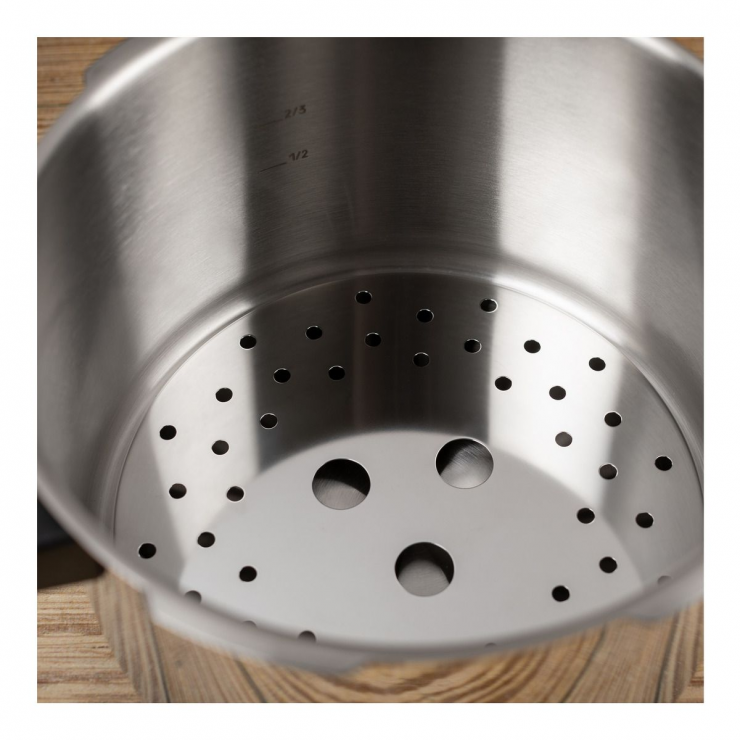 - Incluye una rejilla de cocción para mantener la comida fuera del agua