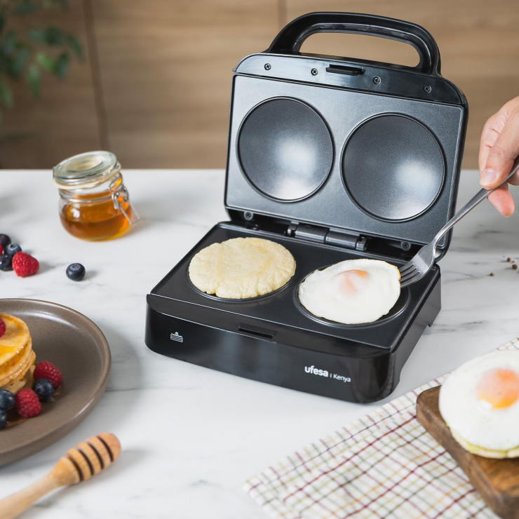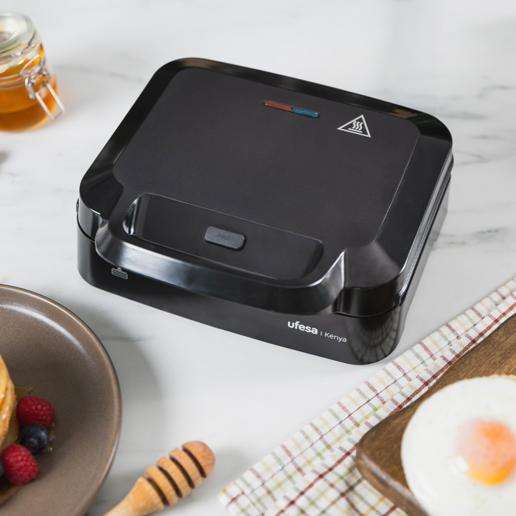 - La sandwichera Kenya de 750 W es perfecta para preparar pancakes esponjosos, huevos en su punto y arepas doradas en pocos minutos gracias a su calentamiento rápido y uniforme. Sus placas con diseño redondo permiten dar forma perfecta a la masa y conseguir una cocción homogénea.