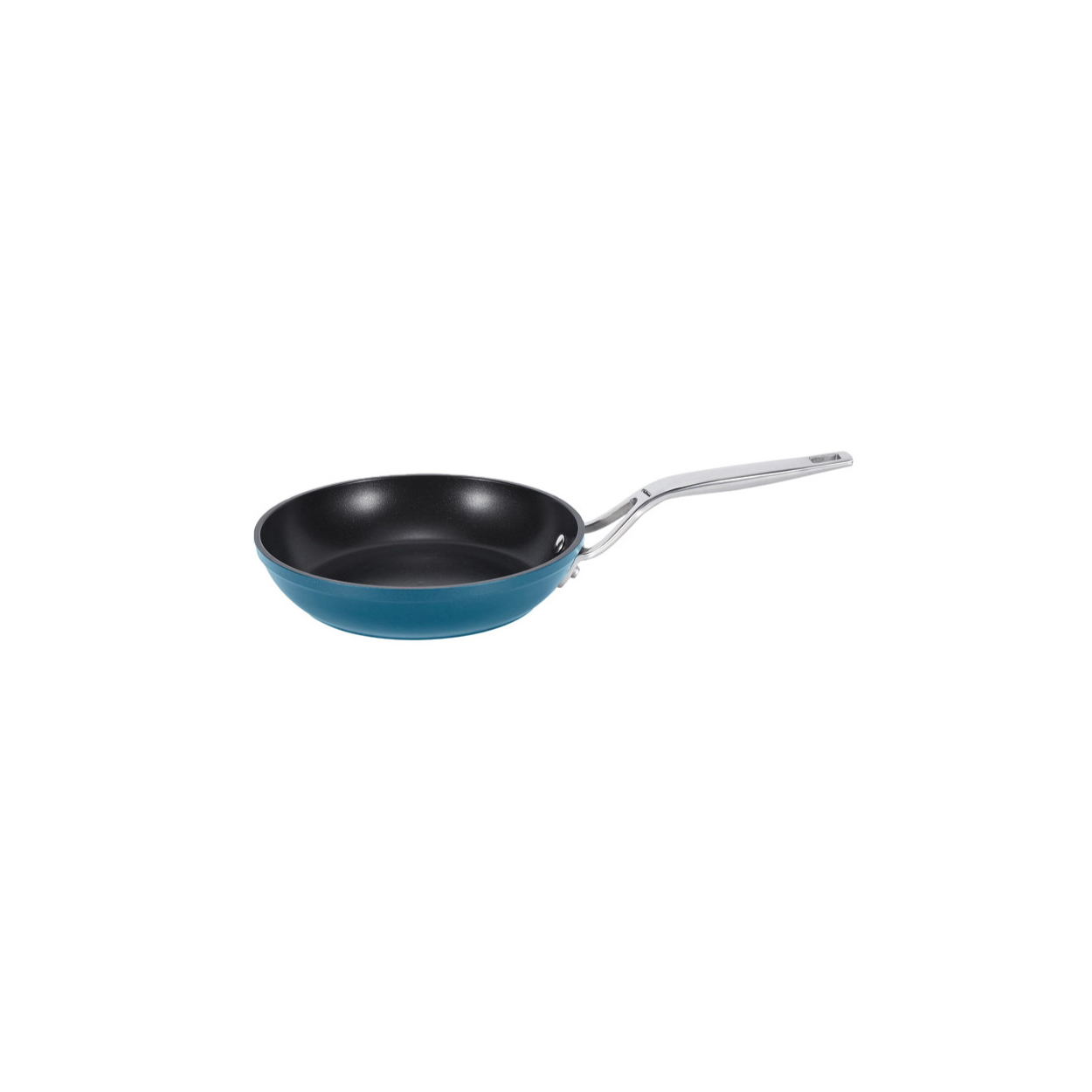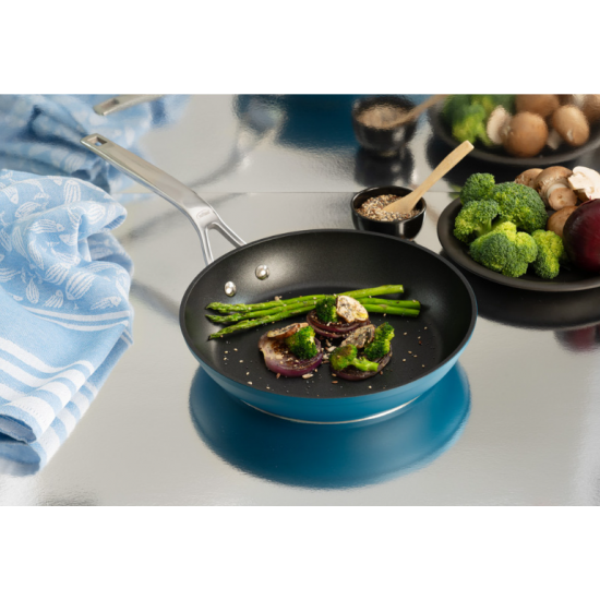 Sartén de aluminio forjado de color azul, con fondo difusor apto para todo tipo de fuegos, incluida la inducción.